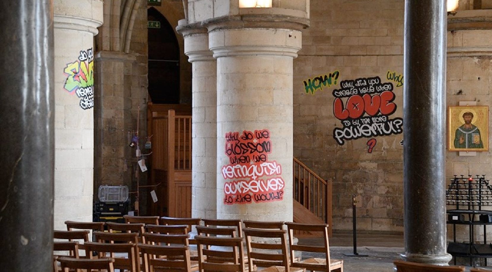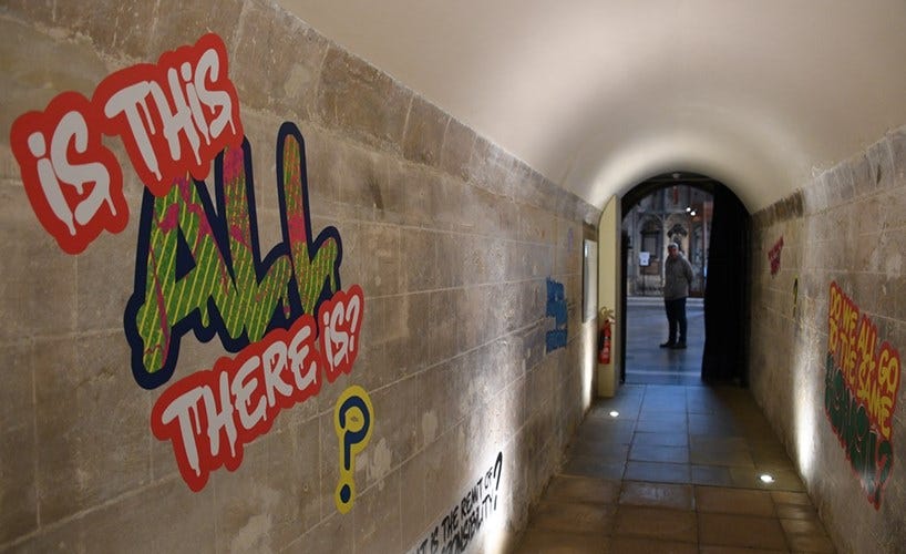 Although the new Burrell Collection texts are printed using the same authority-signaling fonts and visual formats as a conventional museum label, they in practice function more like screens or terminals, receiving and displaying (as though in real time) the most up-to-date signals from “the discourse.” What we might call “activistic ways of knowing” are given formal recognition as a kind of “expert knowledge” through their consecration in the form of gallery text, with its aura of expertise and definitiveness. The new Burrell Collection texts are knowingly provocative. They break the fourth wall of professional convention in order to center (as cant does) the curators’ own emotions and ideological commitments. They make a claim to an unassailable emotional truth through subtly coercive normative frames. The controversial 2025–6 “Hear Us” graffiti exhibition inside Canterbury Cathedral operates according to a similar “terminal-style” logic. Exhibition text posted on the cathedral’s website reported that: